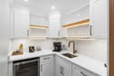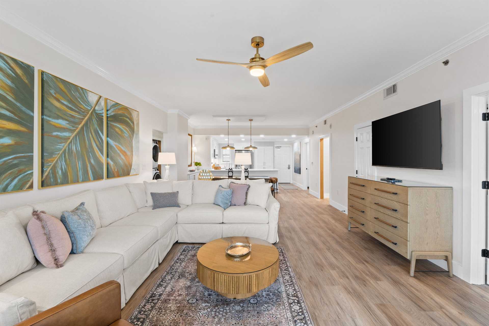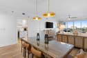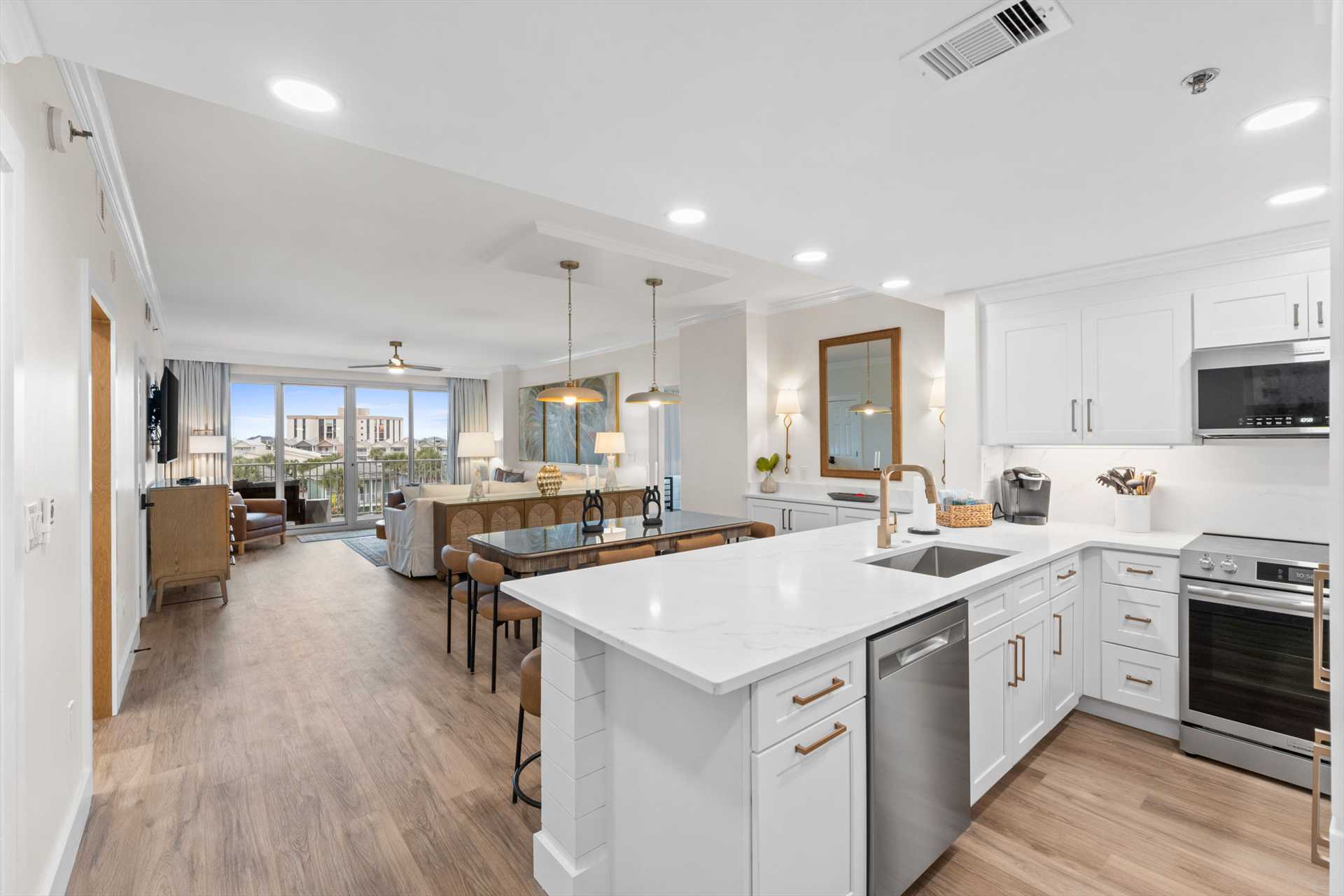 Designed for comfort and gathering, the open living space features a sleeper sectional, designer furnishings, and seamless flow to the balcony where Gulf views steal the show. A custom wet bar and dedicated coffee area add a boutique-hotel touch—perfect for mornings before the beach or evenings winding down after sunset.