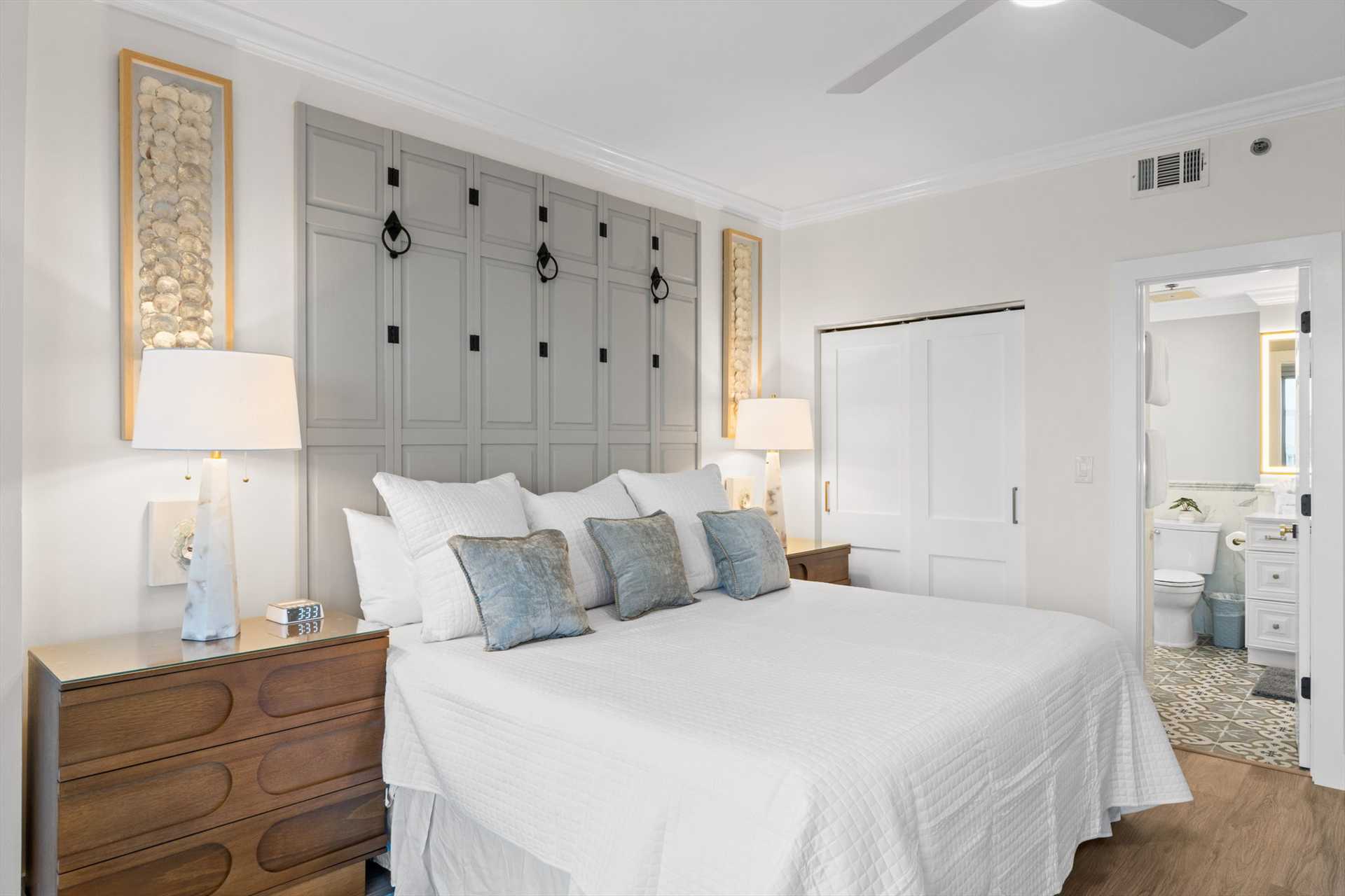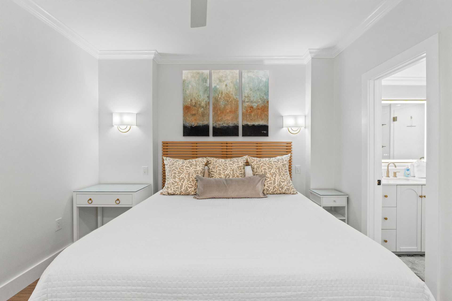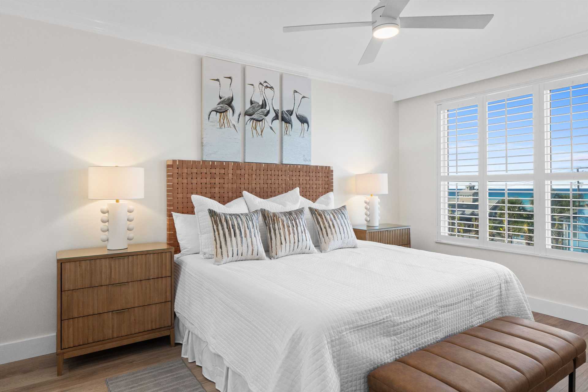 All three bathrooms feature walk-in showers, and every bedroom showcases brand-new King or Queen mattresses, fresh finishes, and a calm, coastal color palette.