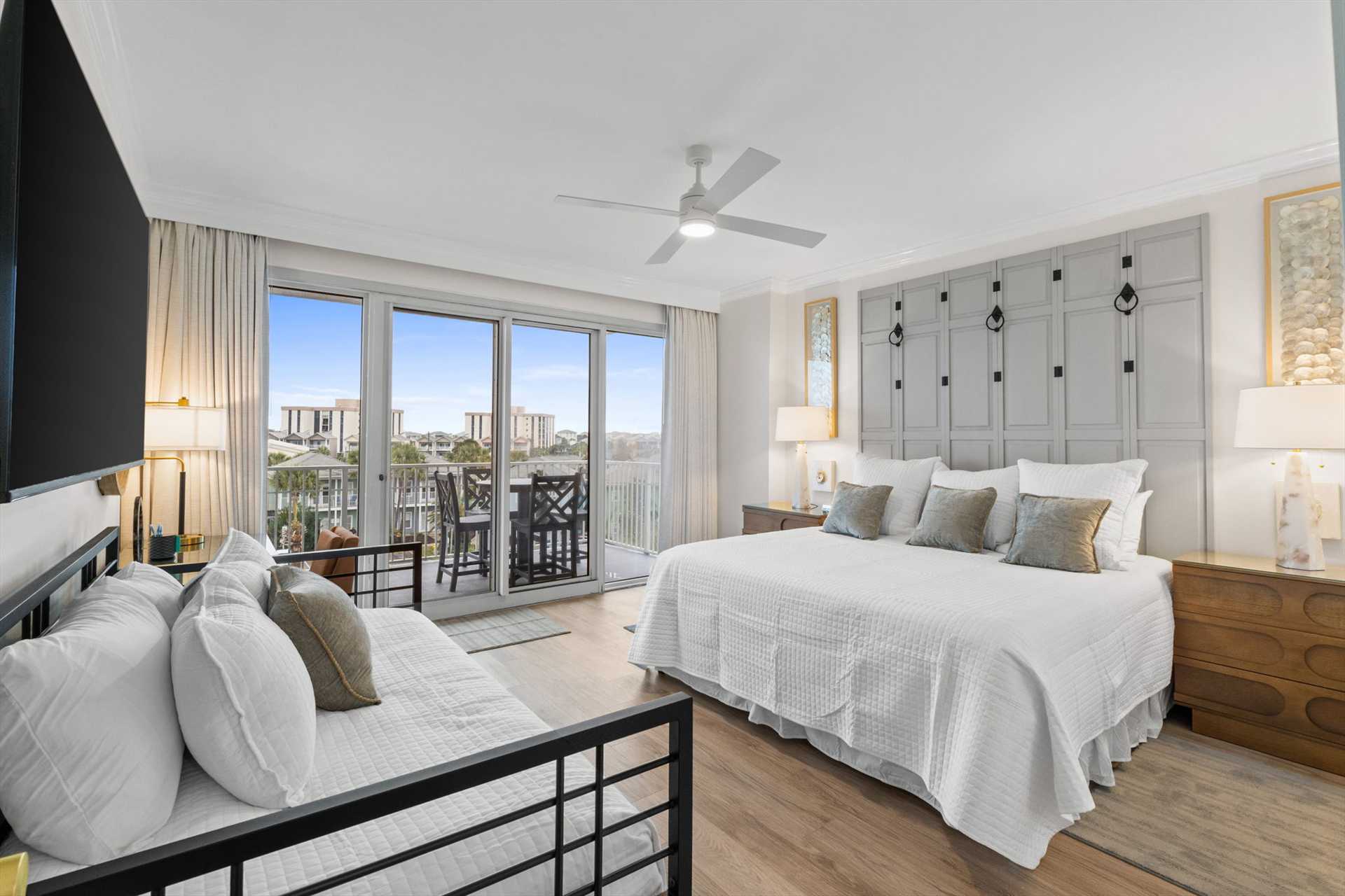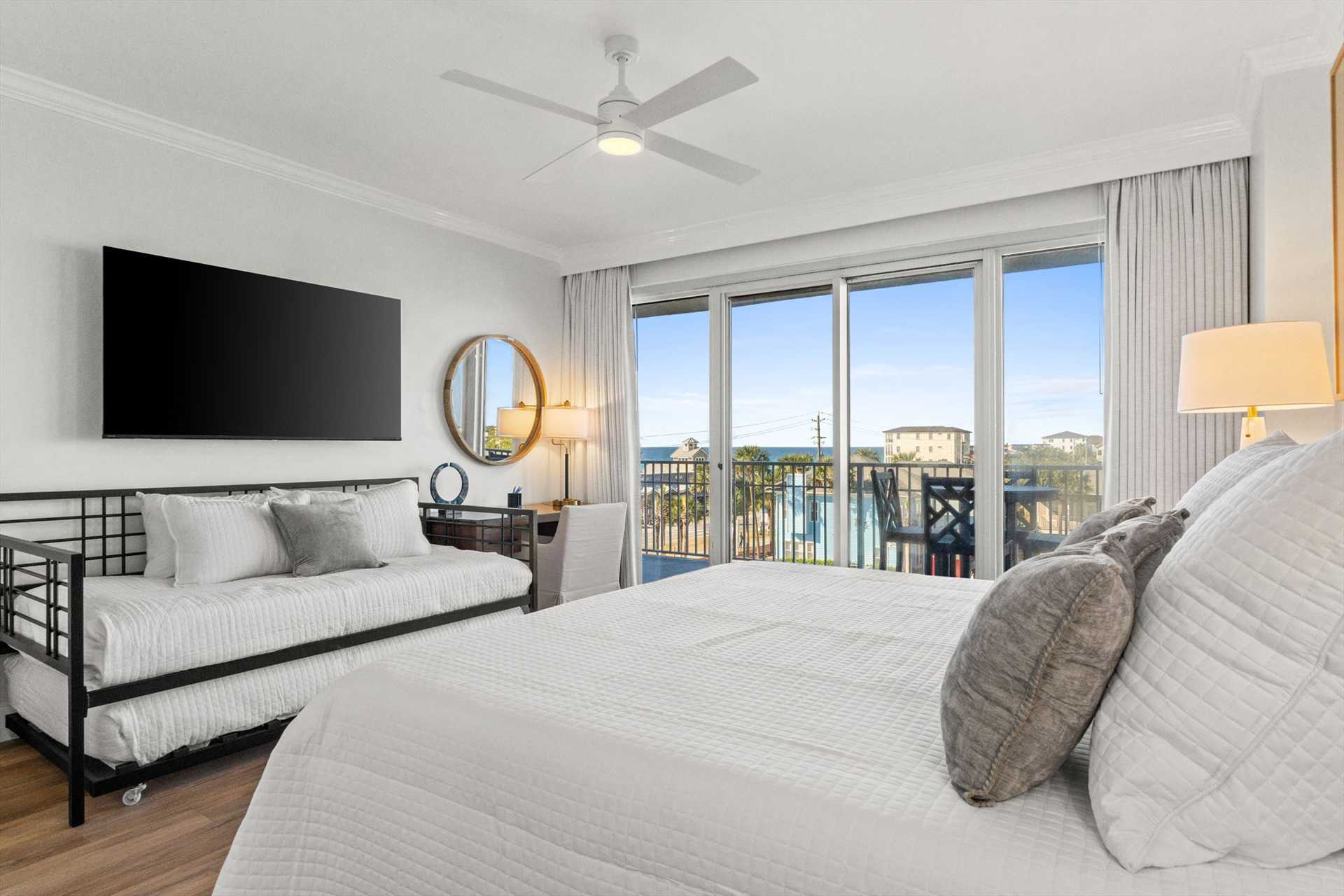 - Bedroom 3: King bed plus a daybed with trundle, private balcony access, and views